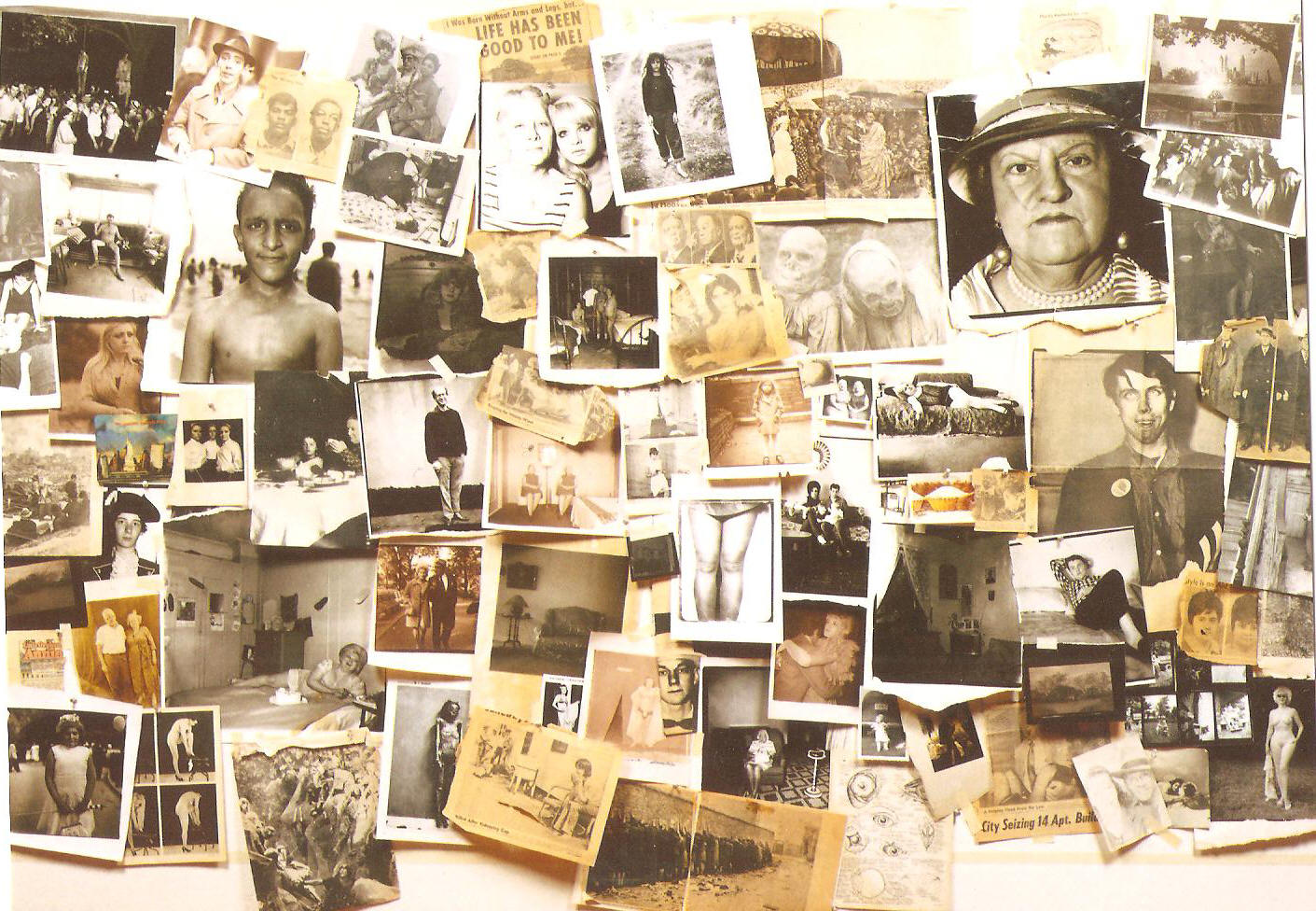 Il s'agit d'un collage de la photographe Diane Arbus. Elle écrivait à ce propos : "I like to put things up around my bed all the time, pictures of mine that I Like and others things and I change it every month or so. There's some funny subliminal thing that happens. It isn't just looking at it. It's looking at it when you're not looking at it. It really begins to act on you in a funny way." |